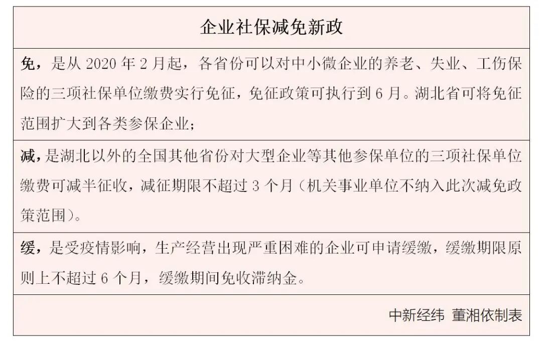 2月20日,人力资源社会保障部副部长游钧在国新办发布会上介绍,三部门研究制定了《关于阶段性减免企业社会保险费的通知》,明确免、减、缓三项措施,各省份可以对中小微企业的养老、失业、工伤保险的三项社保单位缴费实行免征,免征政策执行到6月。